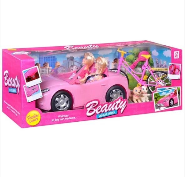 Doua papusi manechin intr-o masina decapotabila roz, bicicleta si 2 caini. PRUDENTA! Nu este potrivit pentru copii sub 3 ani.