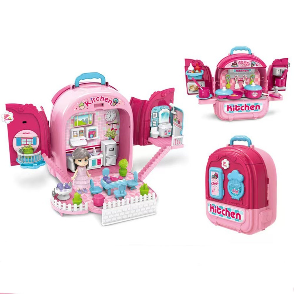 Set ghiozdan jucarie 3 in 1 Rovo 991, Bucatarie, Apartament Fetita, 86 piese, Roz