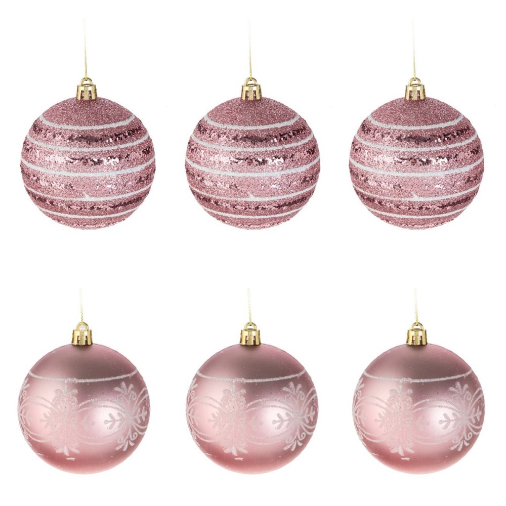 Set Globuri Crăciun, Model 6cm, Roz Mat și Lucios, Modele Albe Irizate, 6 Bucăți, Plastic
