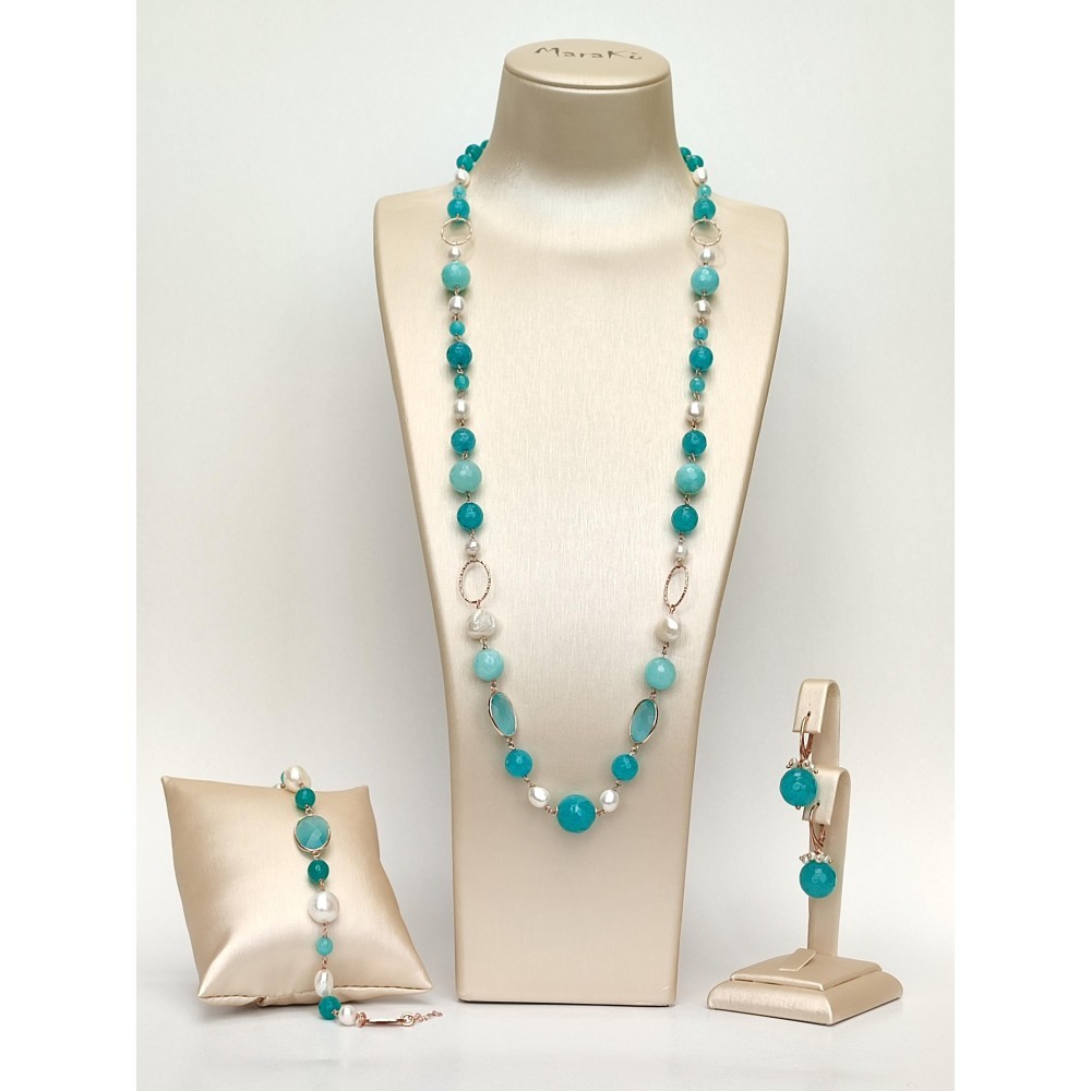 Set Glory din jad verde acvatic și perle, compus din: colier, brățară și cercei . Colier Glory din jad verde acvatic și perle de cultură. Lungime: 75 cm. Brățară Glory din jad verde acvatic și perle de cultură. Lungime: 19 – 23 cm, reglabilă. Cercei Glory din jad verde acvatic și perle de cultură, cu sfere 14 mm. Lungime: 3 cm, cu sistem de închidere. Detalii produs: Argint 925/°°° placat cu aur roz, cu tratament antioxidant unic. Certificat de garanție a materialului. Cutie și pungă cadou incluse. Fiecare bijuterie este realizată manual, cu precizia inconfundabilă Made in Italy. Notă: Pot exista mici diferențe față de imaginea produsului, deoarece fiecare bijuterie este realizată manual, iar perlele sunt neuniforme. Culorile pietrelor semiprețioase pot diferi în funcție de reflexia luminii.
