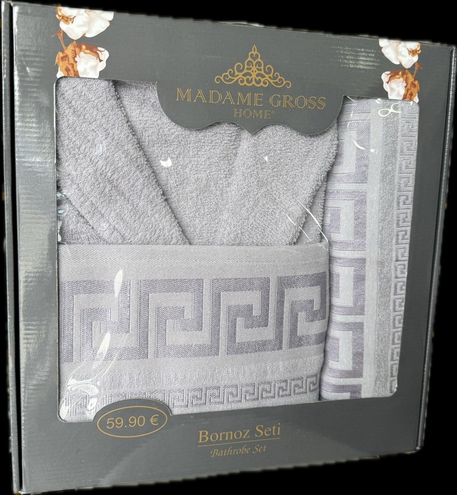 Pachetul contine: un halat de baie masura universala (potrivit pentru M-L), un prosop 50×90 cm, un prosop 70×140 cm pentru baie.