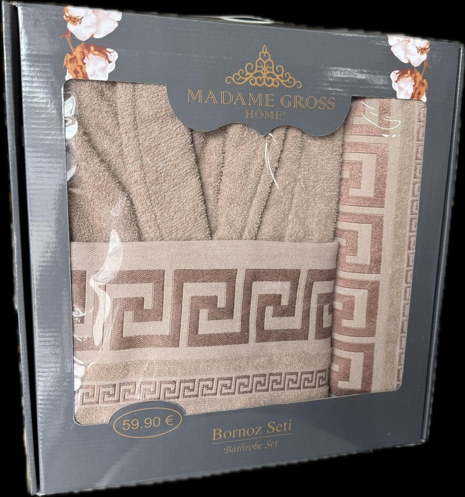 Pachetul contine: un halat de baie masura universala (potrivit pentru M-L), un prosop 50×90 cm, un prosop 70×140 cm pentru baie.