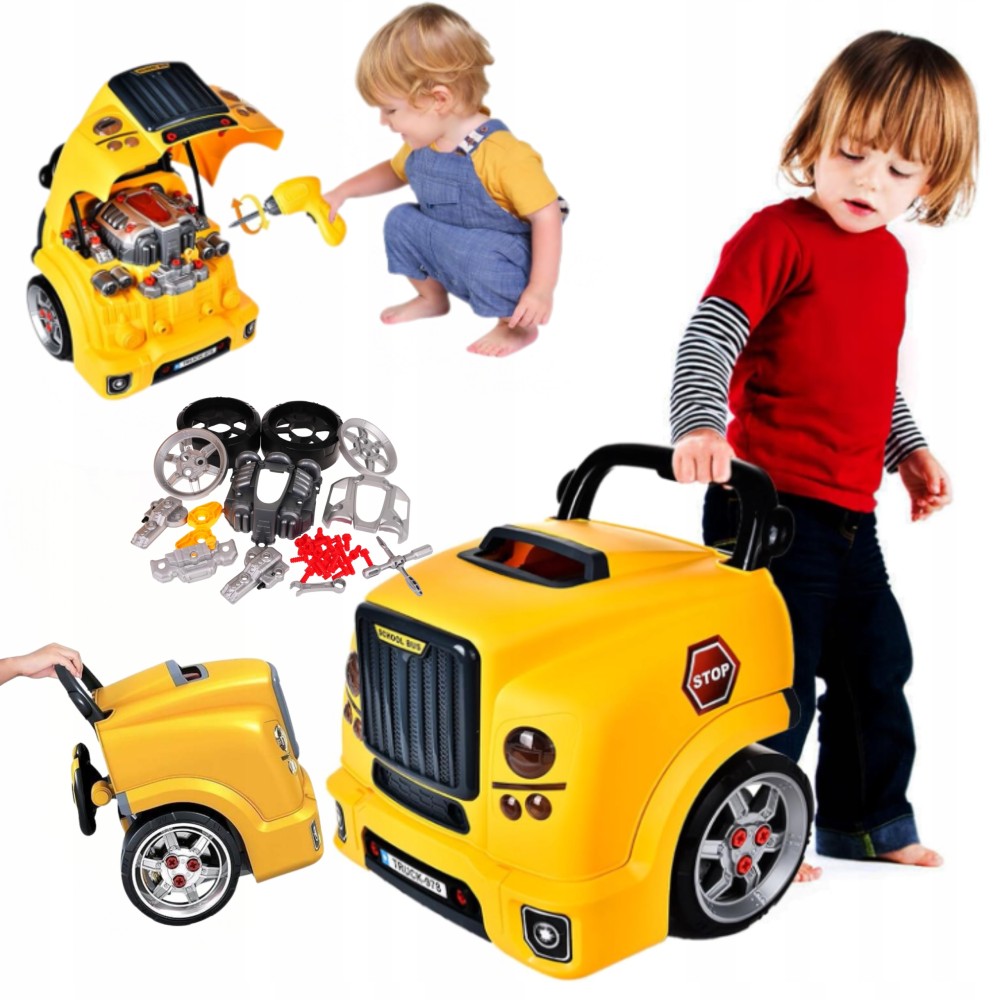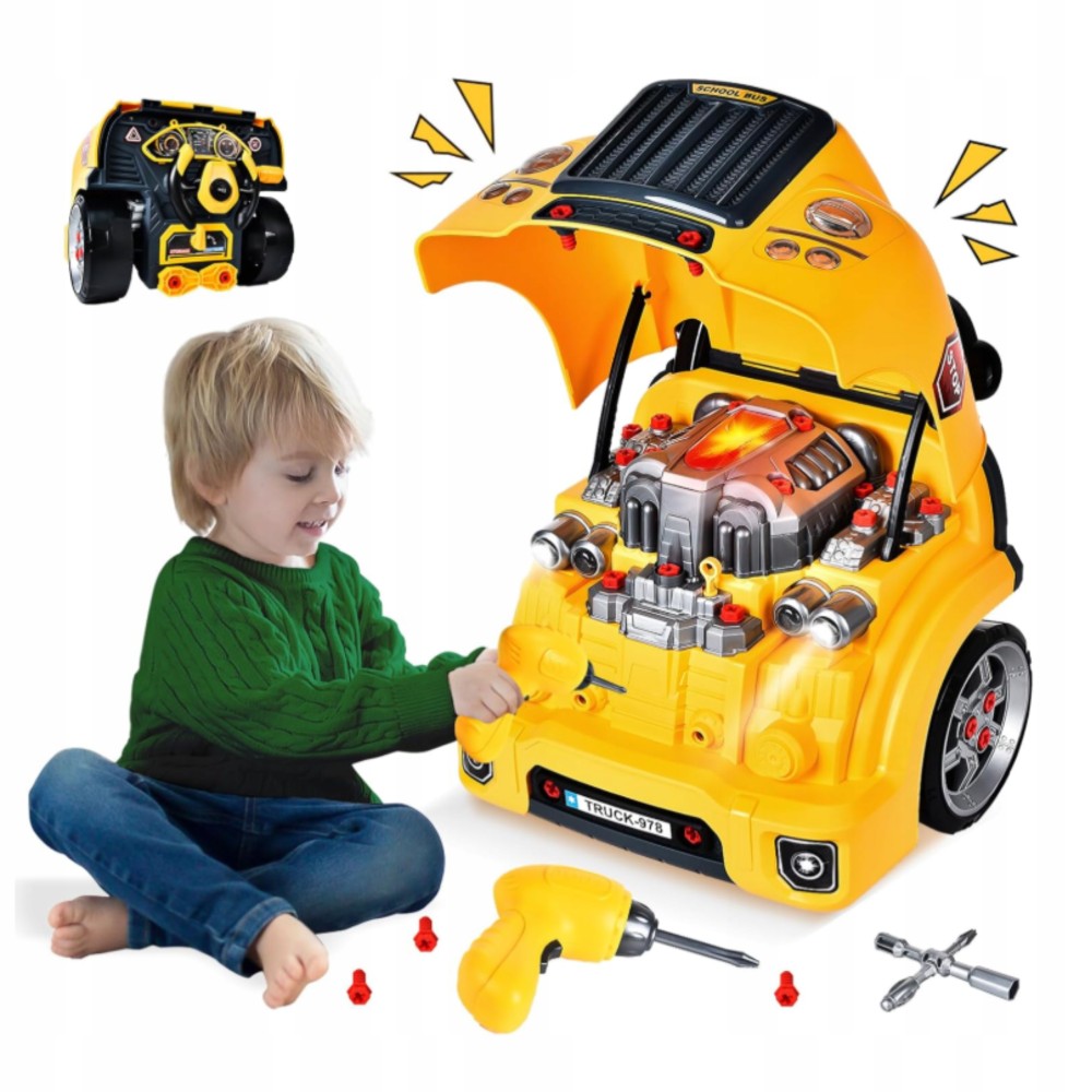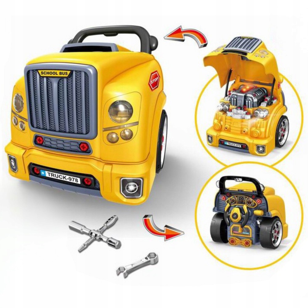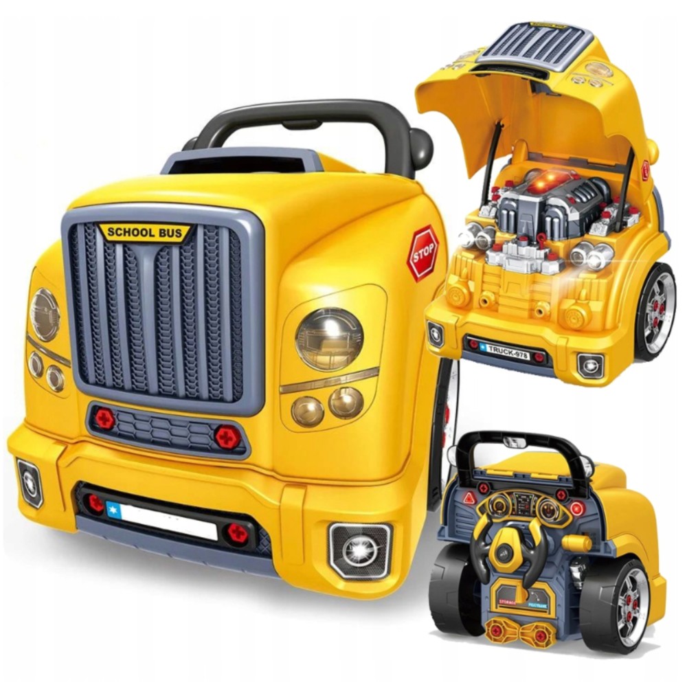 Acest set complet de atelier sub forma unui autobuz școlar american este o jucărie care încântă prin posibilitățile pe care le oferă – repararea motorului, schimbarea vitezelor, volan cu claxon, efecte luminoase și sonore realiste și 59 de piese pentru joacă și învățare!