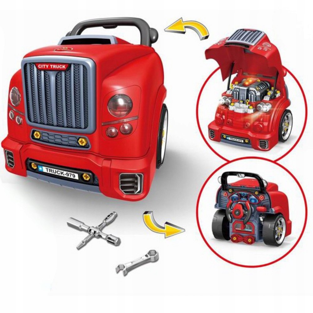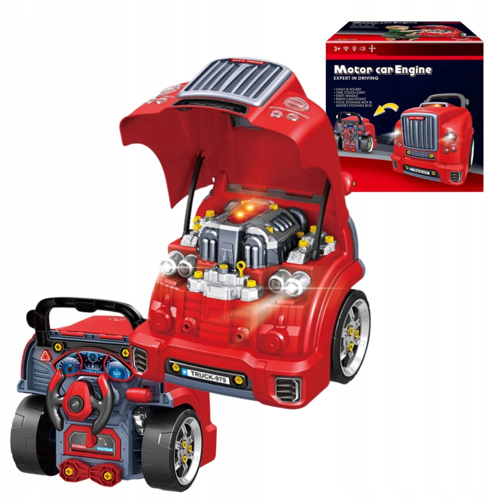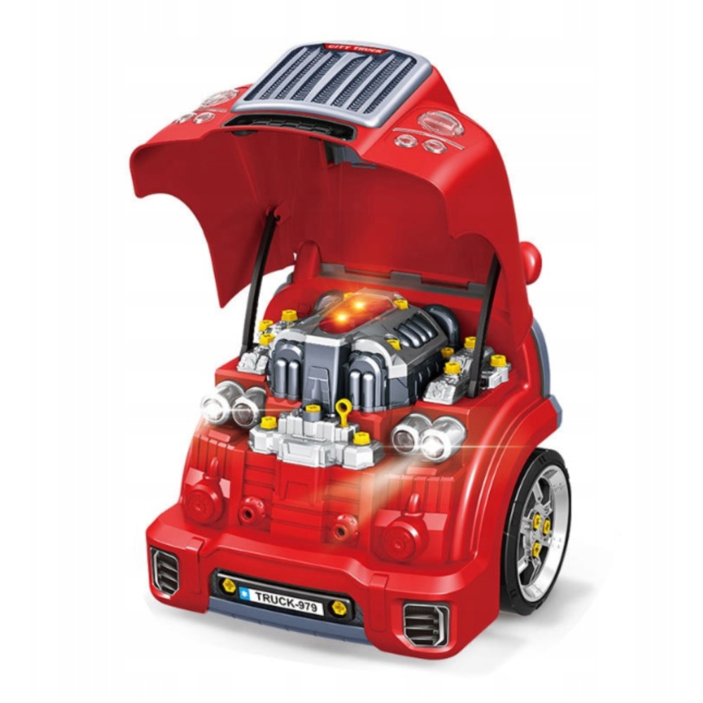 Acest set complet de atelier sub forma unui camion american mare este o jucărie care încântă prin posibilitățile pe care le oferă – repararea motorului, schimbarea vitezelor, volan cu claxon, efecte luminoase și sonore realiste și nu mai puțin de 59 de elemente pentru joacă și învățare!