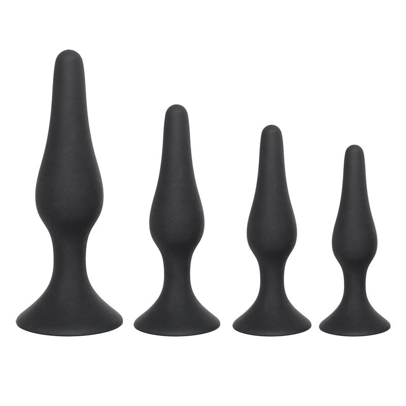 Set format din 4 dildo-uri anale fabricate din silicon. Dildo-urile au forma conica pentru o inserare facila si baza circulara pentru o utilizare lipsita de riscuri. De asemenea, baza dispune de o cupa de suctiune puternica pentru a fi atasat cu usurinta pe suprafetele plane pentru o utilizare fara maini. Dimensiunile fiecarui dildo se regasesc in imaginile alaturate. | Material: Silicon | Lungime: 15 cm | Diametru: 3.5 cm | Culoare: Negru