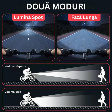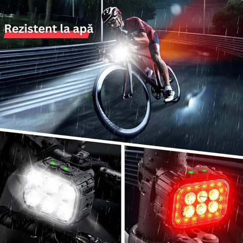 Set Lumini Bicicleta Fata/Spate, 6 LED-uri, 6 Moduri de Iluminare, Rezistent la Apa IP65, Far si Stop, Acumulator Reincarcabil, Instalare Usoara, Cabl