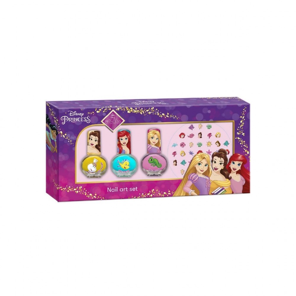 Setul de 3 lacuri de unghii, in culori la moda, Disney Princess, pentru cele mai cochete fetite. Ajuta-ti fetita sa faca primii pasi in lumea infrumusetarii cu unghii unice, colorate si decorate cu personajele preferate! Kitul contine trei oje in culori asortate, pastelate, care se aplica cu usurinta pe unghii cu pensula din capac. Folosind acest set cu lacuri si stickere de unghii, doar imaginatia fetitei dvs. poate stabili limite. Creati, decorati si rasfatati-va cu bucuria creativitatii.