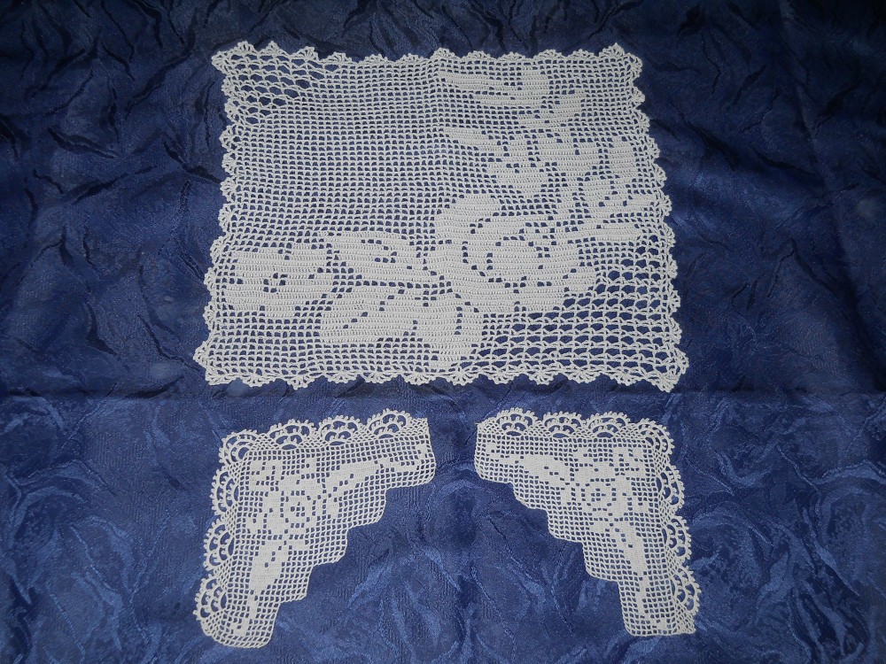 SETUL CUPRINDE 3 BUC MILEURI CROSETATE MANUAL DIN ATA ALBA DE BUMBAC. OBIECTELE SUNT IN STARE FOARTE BUNA, LUCRATE CU MINUTIOZITATE MODEL FLORAL. CELE DOUA BUCATI TRIUNGHIULARE POT FI FOLOSITE LA CONFECTIONAREA UNEI FETE DE PERNA SAU ALTE IDEI. PRETUL ESTE PER SET.