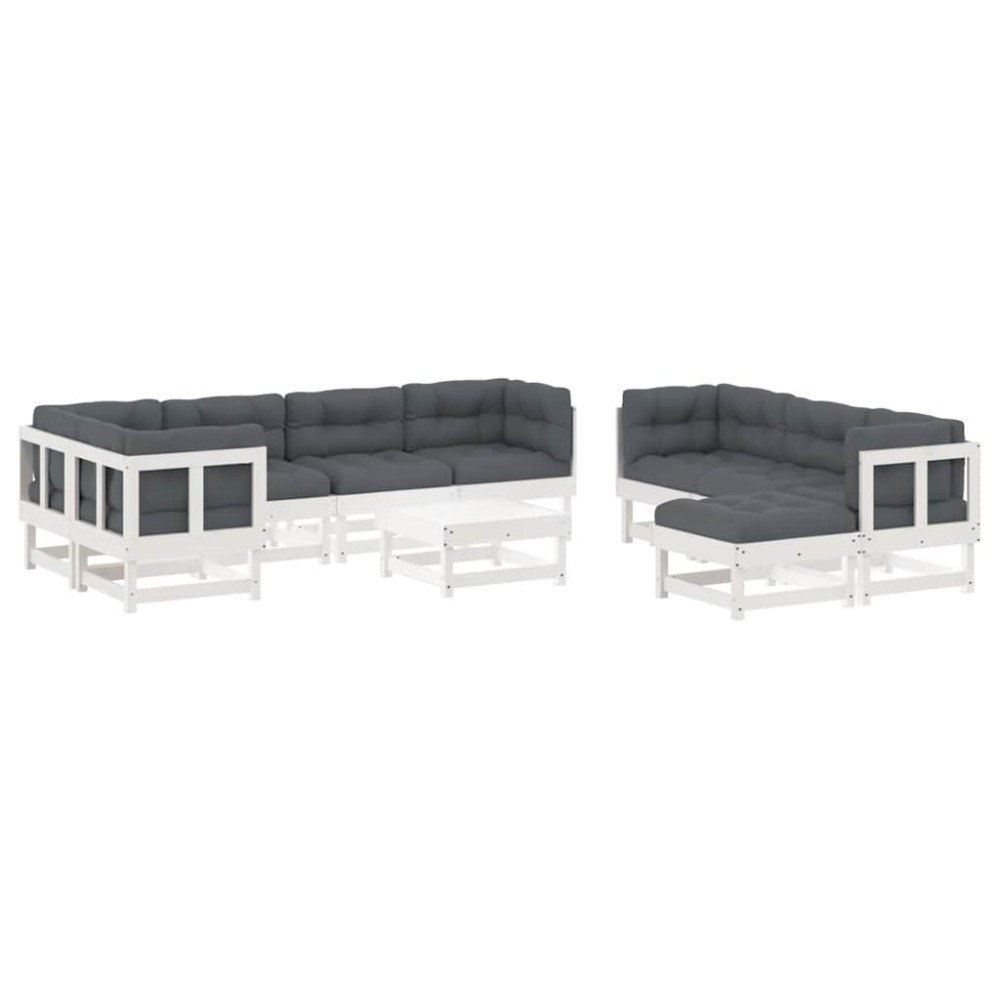 Set mobilier de gradina cu perne, 10 piese, alb, lemn masiv