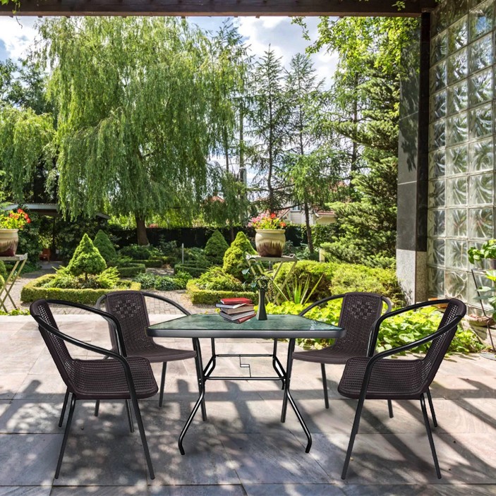 Setul modern de mobilier de grădină include o masă de grădină cu blat de sticlă și 4 scaune. Mobila este concepută pentru 4 persoane . Scaunele și baza mesei sunt fabricate din oțel. Blatul mesei este fabricat din sticlă securizată de 5 mm , rezistentă la zgârieturi minore. Materialul din plastic al șezutului scaunului este rezistent la condițiile meteorologice . Avantajul său constă în scaunul și cotierele profilate ergonomic , care ușurează umerii în timpul odihnei.