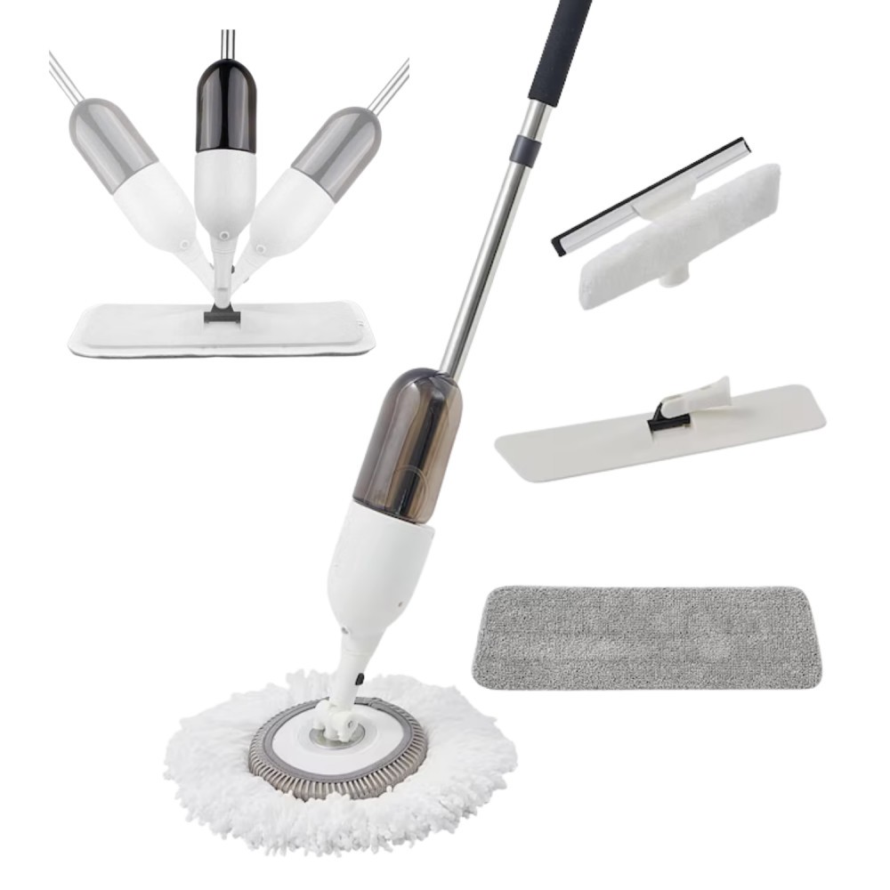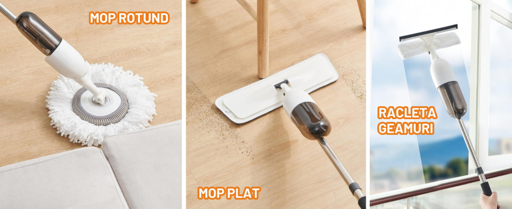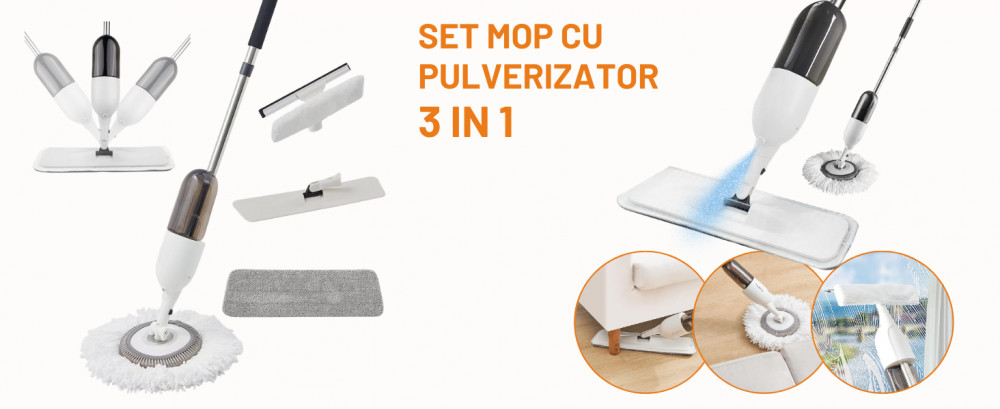 Set Mop 3 in 1 cu Pulverizator , mop Rotund si Plat din Bumbac, Racleta pentru Geam - Dreamramp Curatenie Eficienta intr-un Singur Set