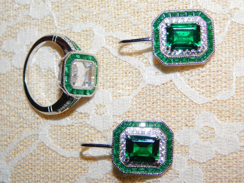 Set nou Italia , argint sterling silver , nickel free, rodiate care confera aspectul de platina , safire si smaralde , 4 carate , 6 grame / fiecare ,/ taietura prima smarald , spectaculos , cercei cu tortite libere ,