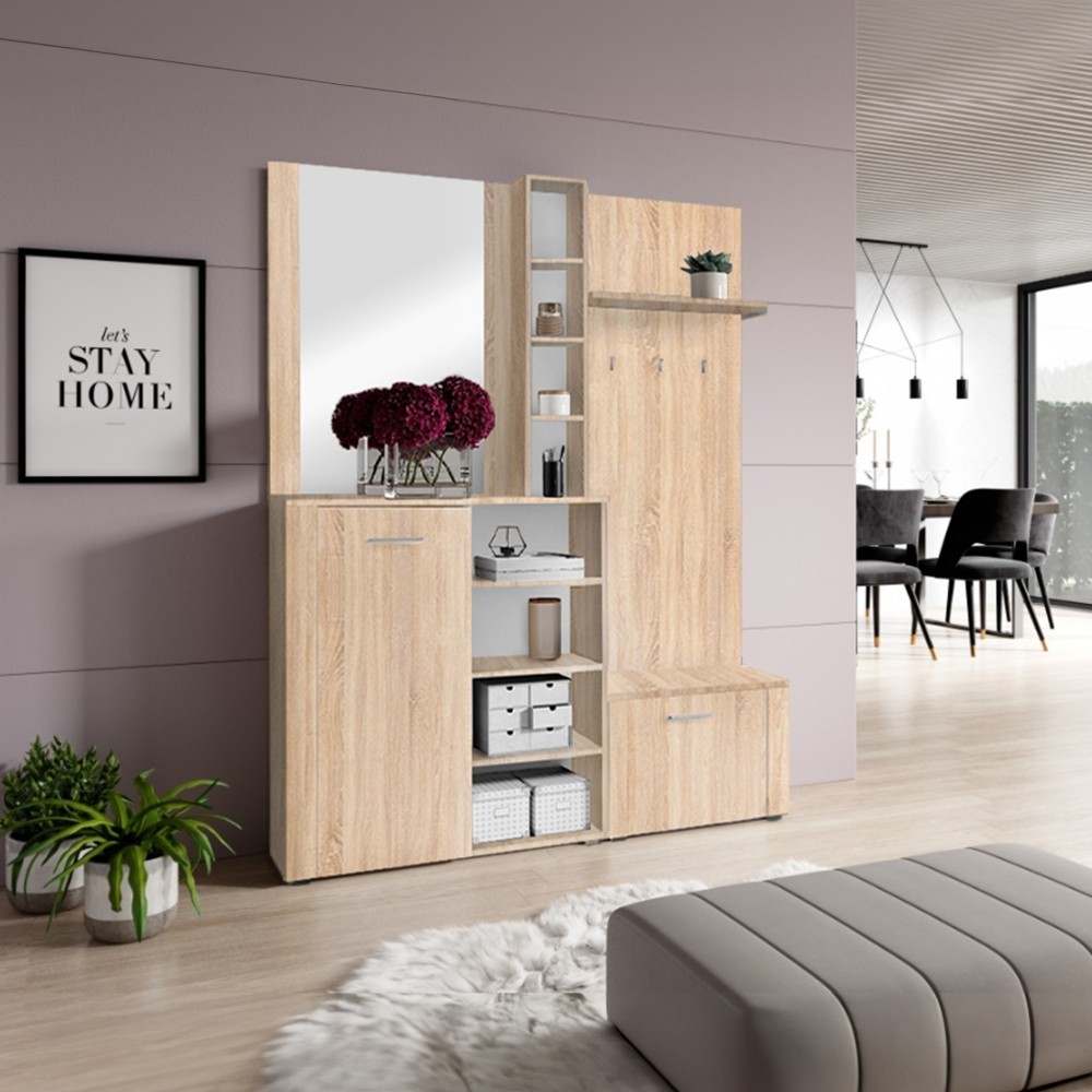 Material: PAL melaminat Culoare in ordinea imaginilor: stejar sonoma, alb/beton, stejar artisan/grafit. Dimensiuni (Lxlxh): 150x32x190 cm Pantofar Oglindă Dimensiuni oglindă (Lxlxh): 69,8x1,9x90,4 cm Spaţiu de depozitare deschis Dulap cu poliţe Dimensiuni dulap (Lxh): 40,4x95 cm Poliţă Două cârlige Portanţa cârligului: 1 kg AKCES-PLAST Mânere din plastic Culoarea mânerelor: argintie Vă recomandăm să ataşaţi mobilierul de perete Livrat dezasamblat