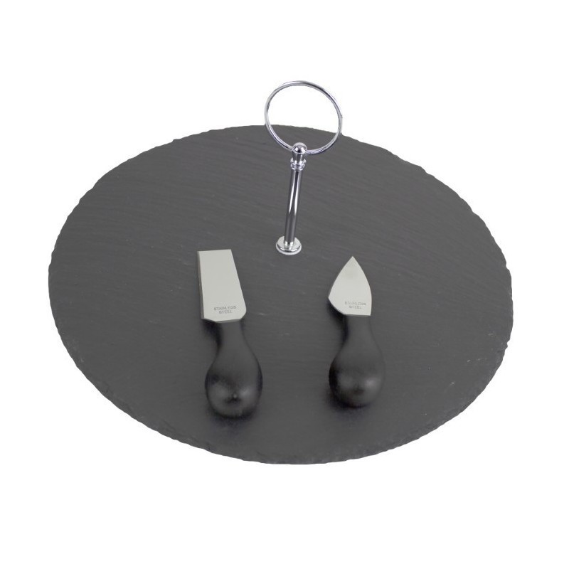 Set platou si ustensile pentru branzeturi, este compus dintr-un paltou fabricat din ardezie cu maner si doua cutite mici pentru branzeturi. Set platou si ustensile pentru branzeturi, are un diametru de 30 cm si este ideala pentru a servi diferite tipuri de branza. Se spala manual si se sterge cu o laveta. Mai multe platouri pentru bucatarie gasesti pe site-ul nostru azhome.ro