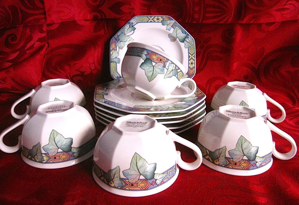 SET SASE CESTI CU SASE FARFURIOARE DIN PORTELAN VILLEROY&BOCH MODEL PASADENA . SETUL ESTE IN STARE FOARTE BUNA DAR FARFURIOARELE AU USOARE ZGARIETURI IN LOCASUL CENTRAL PENTRU CEASCA . CESTILE AU INALTIME DE 5 CM SI DIAMETRUL DE 8.5 CM , FARFURIILE AU 15 CM