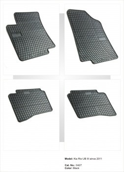Presuri cauciuc Kia Rio III dupa 2011 Fabricatie: 08.2011-prezent Toate caroseriile: hatchback 5 usi, sedan 4 usi Caroserie: (model cod UB) Avantaje: -Sunt create dupa forma si dimensiunile fiecarei masini; -Cauciuc de calitate excelenta, fara miros, placut la atingere, foarte bine finisat, rezistent si durabil; -Suprafata striata impiedica alunecarea incaltamintei si retine murdaria si apa; -Margine de protectie inalta de 1cm; -Impermeabile si rezistente la temperaturi inalte si joase, la uleiuri si substante chimice; -Covorasul soferului are intarituri suplimentare;