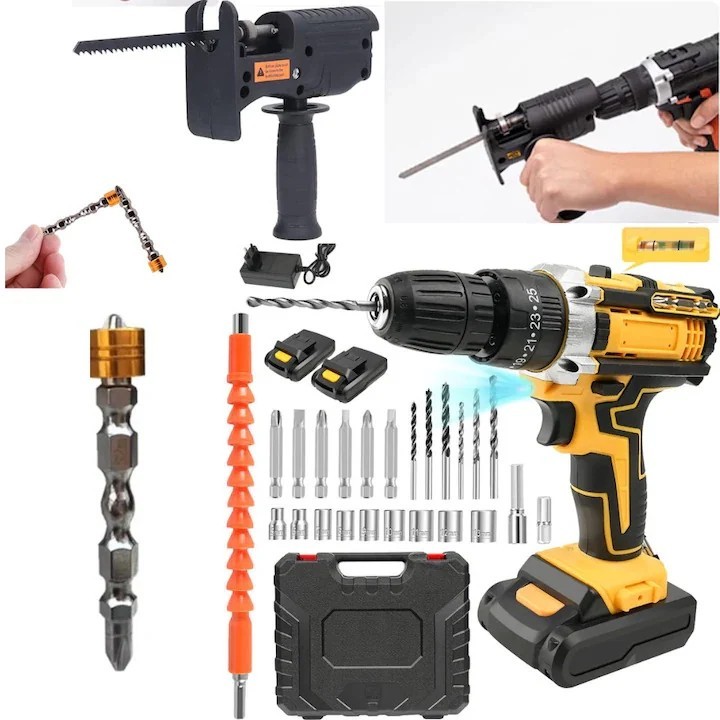 Set Profesional APF®: Bormasina 24V cu 2 Acumulatori + Adaptor Fierastrau Alternativ + Cap Magnetic cu 2 Capete