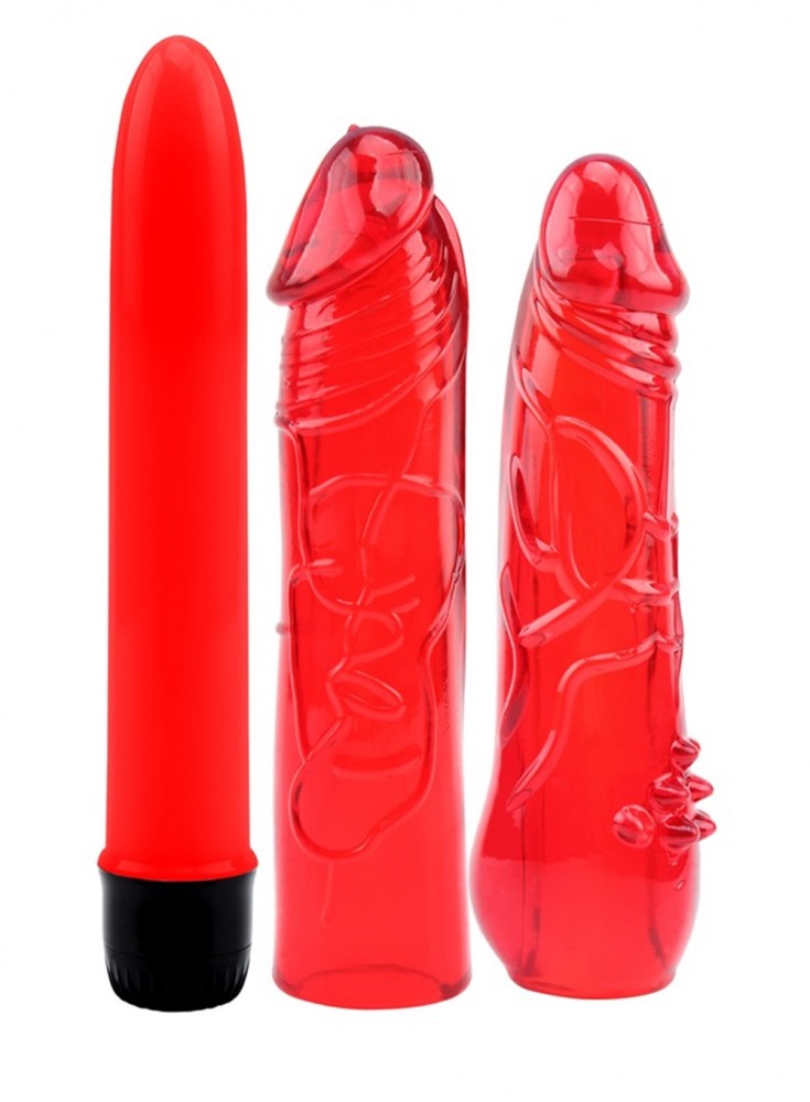 Vibrator clasic de culoare rosie, confectionat din ABS cu suprafata neteda si lucioasa, potrivit pentru stimularea tuturor zonelor erogene. Mai exact, produsul se poate folosi atat pentru stimularea vaginala, cat si pentru stimularea clitoridiana si anala, avand dimensiuni clasice si forma dreapta. Este prevazut cu 2 mansoane adiacente din material striat, moale si catifelat, realizate intr-un design realistic diferit cu detalii de tip gland, vene si formatiuni bine evidentiate. Fiecare din cele 2 mansoane se poate aplica pe vibrator daca se doreste acest mod de utilizare pentru senzatii suplimentare de placere.Mansoanele sunt realizate in aceeasi nuanta de rosu romantic ca si vibratorul, dintr-un material fin, care se simte foarte placut in contact cu pielea umana.Produsul are multiple trepte de vibratii si functioneaza pe baza a 2 baterii de tip AA care nu sunt incluse, acestea putand fi achizitionate separat. Vibratiile se actioneaza facil miscand stanga-dreapta rotita neagra de la baza.Pentru a evita deteriorarea produsului se recomanda folosirea impreuna cu lubrifianti pe baza de apa si igienizarea produsului cu solutii speciale de curatat jucariile erotice. | Material: TPE + ABS | Lungime: 21 cm | Diametru: 4 cm | Baterii: 2 x AA | Culoare: Rosu