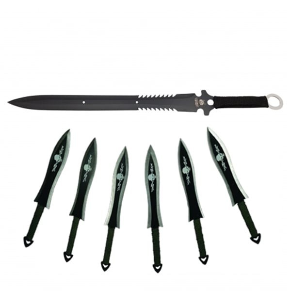 Set sabie de vanatoare Last Ronin si sase cutite de aruncat, otel inoxidabil, negru