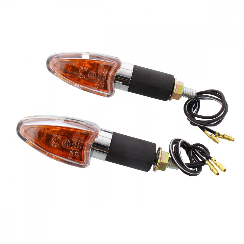 Set semnalizari Cateye 12V 21W BAY9S brat lumg prindere M8 culoare argintiu/negru