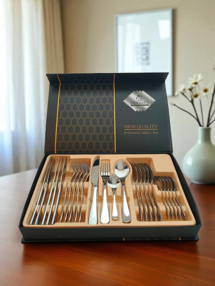 Set tacâm argintiu 24 piese cu finisaj lucios - tot ce ai nevoie pentru o masă completă și armonioasă.