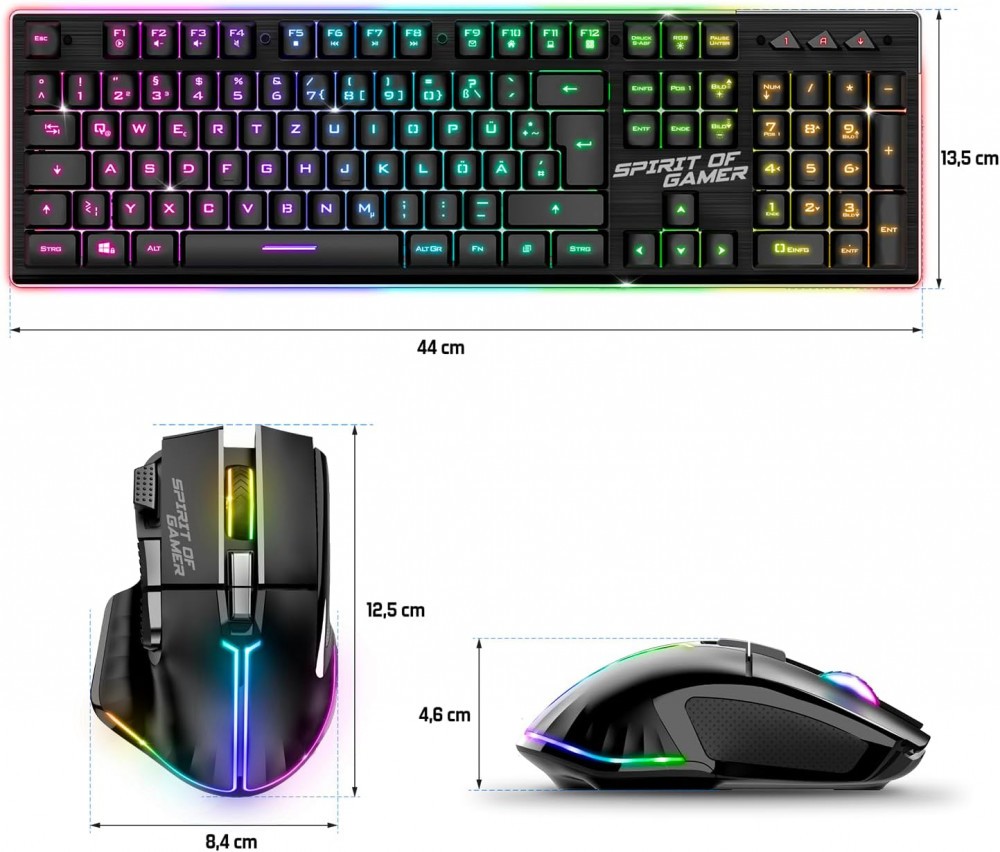 Set mouse-uri cu tastatură pentru jocuri SPIRIT OF GAMER x Ultimate 600 Gaming Mouse fără fir negru reîncărcabil RGB DE Placă semi-mecanică din aluminiu Mouse fără fir de 4800 DPI..Set mouse-ul tastatură fără fir: gata de cabluri enervante. Acest set de tastatură și mouse pentru jocuri vă oferă libertate absolută de mișcare și, în același timp, asigură o conexiune fără latență, fără fir de 2,4 GHz. Autonomie de lungă durată: scufundă-te într-o lume fără limite cu bateriile de lungă durată ale setului Ultimate 600. Jucați non-stop până la 120 de ore și dezvăluie-ți potențialul fără întrerupere. Răspuns și confort: tastele silențioase, semi-mecanice ale tastaturii de gaming ULTIMATE 600 combină senzația tastaturilor mecanice cu ușurința tastaturilor cu membrană și asigură astfel o experiență de joc optimă. Compatibilitate: acest set cu mouse si tastatura wireless nu este compatibil doar cu PC-ul, ci si cu console precum: PS4, PS5, Xbox. Vă rugăm să verificați dacă jocul dvs. permite utilizarea unui mouse și a unei tastaturi. Reduceți efortul: mouse-ul pentru jocuri wireless Ultimate 600 combină performanța și confortul. Echipat cu un suport pentru degetul mare, garantează o prindere confortabilă și ergonomică pentru utilizatorii dreptaci. Gata de joc? Acest mouse de gaming este echipat cu 8 butoane, inclusiv 1 buton rapidfire. Pentru mai multă precizie, îi puteți seta și rezoluția de la 1200 la 4800 DPI. Creați o atmosferă captivantă: oferă o notă estetică setării tale chiar și în întuneric cu acest set de jocuri. Iluminarea de fundal RGB curcubeu a setului Ultimate 600 oferă o atmosferă captivantă și plăcută.