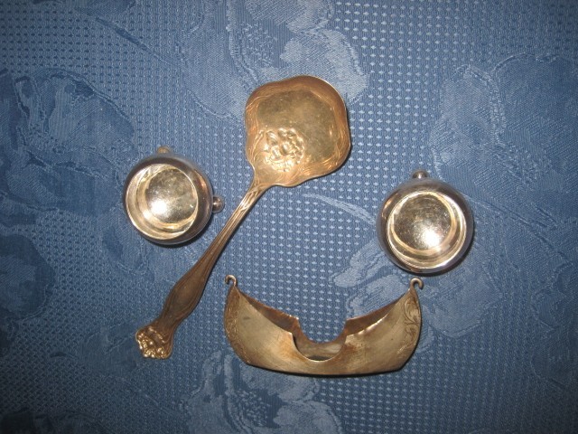 Set miniaturi décor vitrina: lingurita 14cm, barcuta gravata 8_4cm, cescute 4cm. Material metal, probabil alpaca argintata. Stare buna.