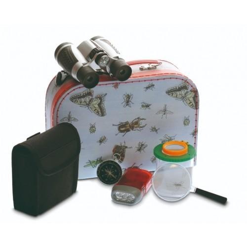 Setul contine valiza cartonata cu maner binoclu busola lupa torta