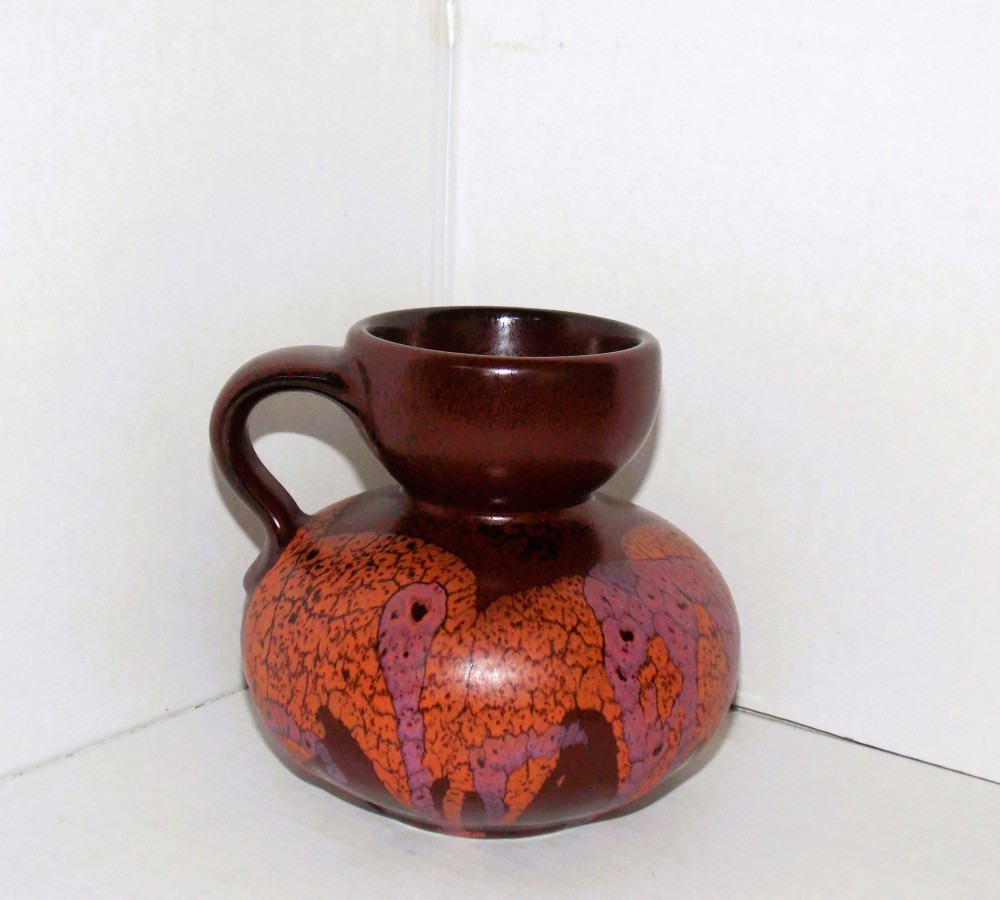Un spectaculos sfeșnic globular cu ansă, ceramică emailată fat-lava. Dincolo de forma inedită, superbă, cromatica smalțului este fabuloasă de-a dreptul. Combinația de culori, bordo, crem, lila-mov și negru, este superbă, de mare finețe și efect. Fiecare decor este unic, acele „arabescuri” sunt irepetabile!