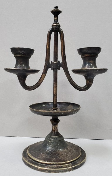 Sfesnic din metal argintat cu doua lumini. H = 24 cm