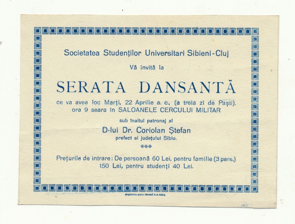 Sibiu - invitatie serata dansanta a studentilor în Cluj organizata de prefectul Coriolan Stefan (aprox. 1930).