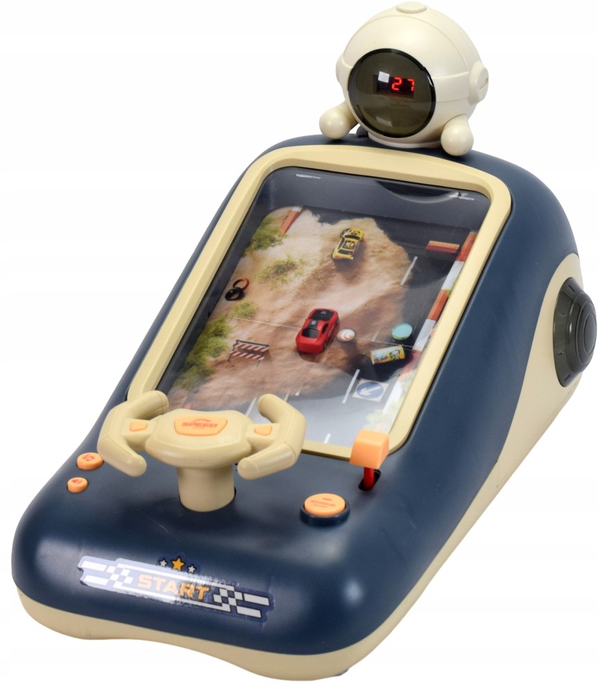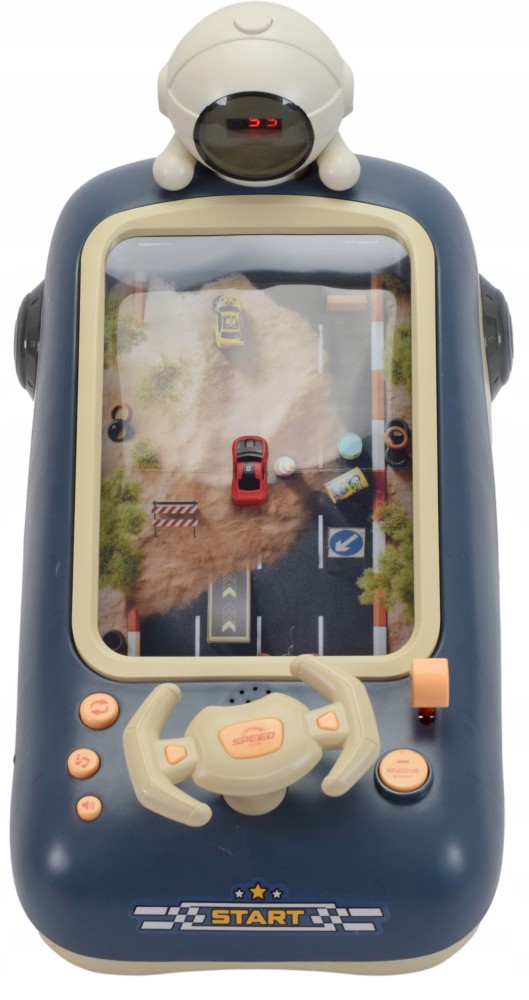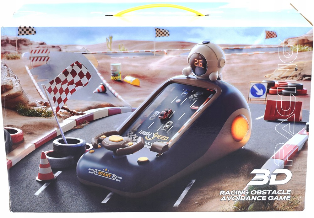 Este foarte ușor de utilizat – mai întâi, introduceți 3 baterii în slot, apoi așezați jucăria pe orice suprafață plană – dispozitivul are patru ventuze pentru a-l menține în poziție în timp ce vă jucați. Sunteți gata de joacă! Deplasați-vă pe pistă și evitați obstacolele rotind volanul la stânga sau la dreapta.