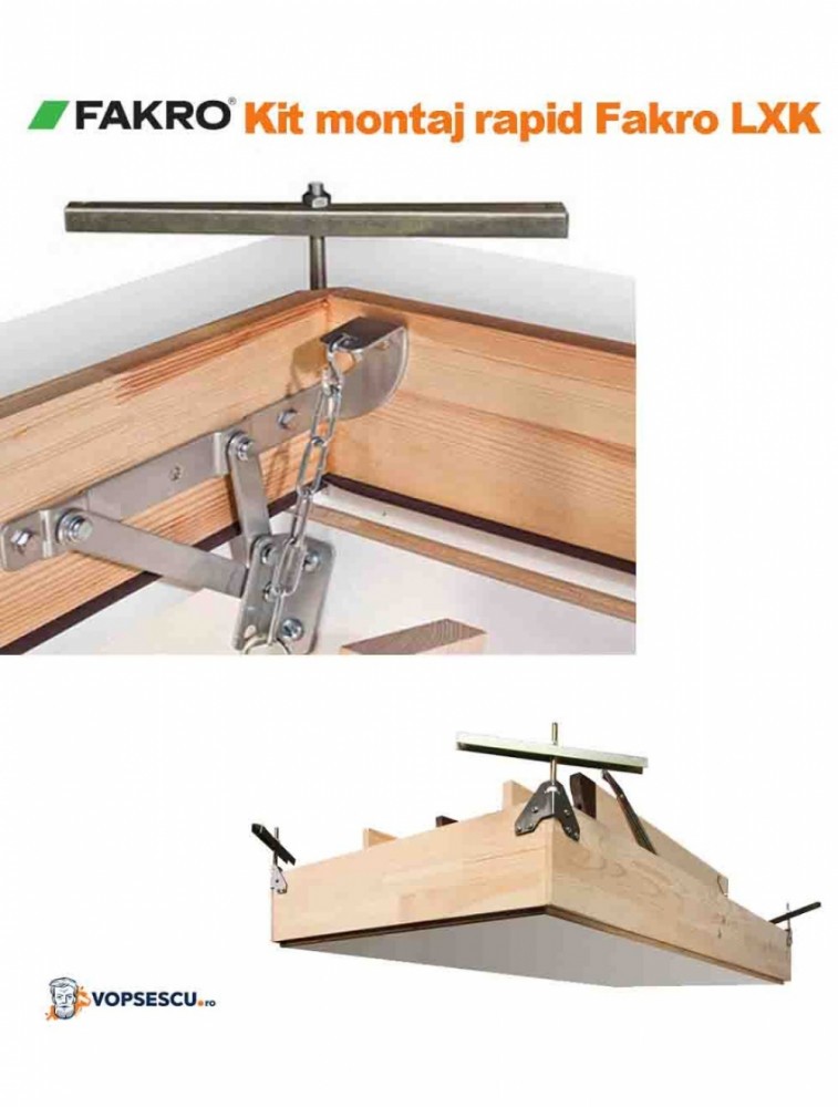 Sistem pentru montaj rapid FAKRO LXK – Simplifica montajul scarilor în structura tavanului. Grosimea maxima a tavanului poate fi de 35cm, exceptie facând scarile LTK unde grosimea maxima a tavanului poate fi de 43cm. Disponibil pentru scarile LWS, LWK, LWL, LTK, LWF, LWT, LMS, LMK.
