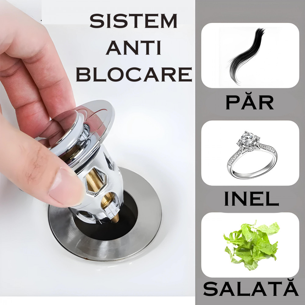 Sita Sifon APF® pentru Chiuveta Baie ,Bucatarie ,Cabina Dus cu Nucleu Pop-Up si Colector de Par, din Cupru si ABS, Usor de Curatat