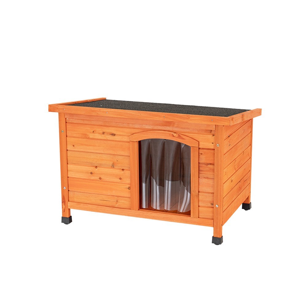 A kutyaház műanyag ajtaja további védelmet nyújt hideg ellen, és távol tartja az esőt és a szelet. Az ajtó lamellás kialakítása könnyű belépést és kilépést biztosít a kutyának. A bejárat méretei: 25(széles)x36(magas) cm.