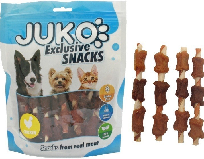 Sticksuri din piele de vita acoperite cu carnita de pui si rata. Snack-ul este dedicat tuturor raselelor de caini, fiind folosit ca recompensa sau ca supliment alimentar. Este ambalat in punga de 250g.