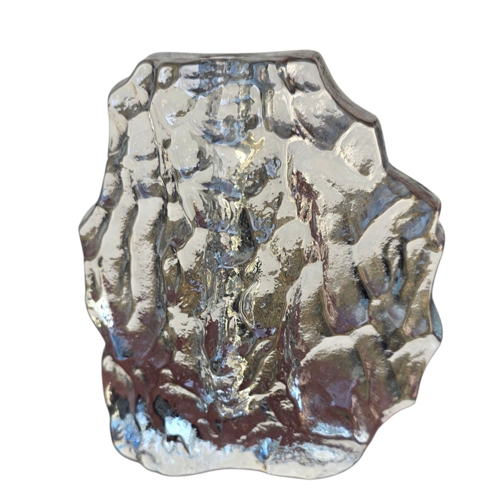 Soliflora minimalista vintage din sticlă transparentă masiva, cu model in relief ce imită gheața. Dispune de un orificiu central pentru o floare.