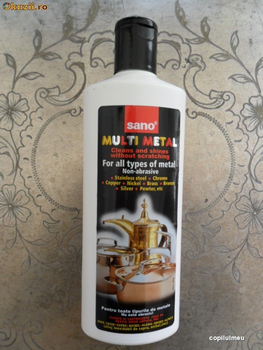 Solutie crema pentru curatarea obiectelor de argint, alama, bronz, alpaca, metal argintat, nichel, crom, inox etc. Se poate folosi pentru tavi, sfesnice, tacamuri, bijuterii etc. NU zgarie suprafetele.