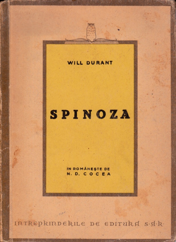 Spinoza, de Will Durant, editura S.A.R., București, 1946, 106 pagini. Pentru Bucuresti fac predare personala. Pentru alte localitati 11 ron taxe postale cu ramburs sau 5 ron colet simplu cu plata prin virament bancar.