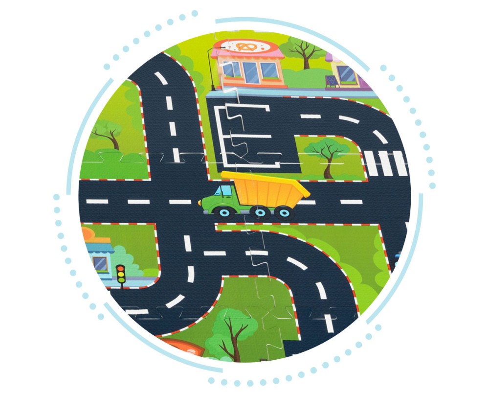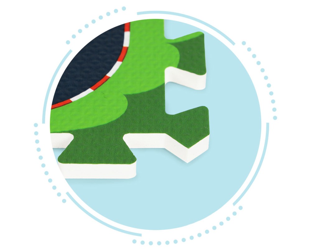 Covorașul este alcătuit din pătrate colorate, ale căror margini au "dinți" speciali care le permit să fie combinate în orice mod. Grosimea covorului (1 cm) asigură o protecție adecvată împotriva căderilor și îl face plăcut de moale. Covorul are o texturăspecială antiderapantă și este complet sigur pentru copii.