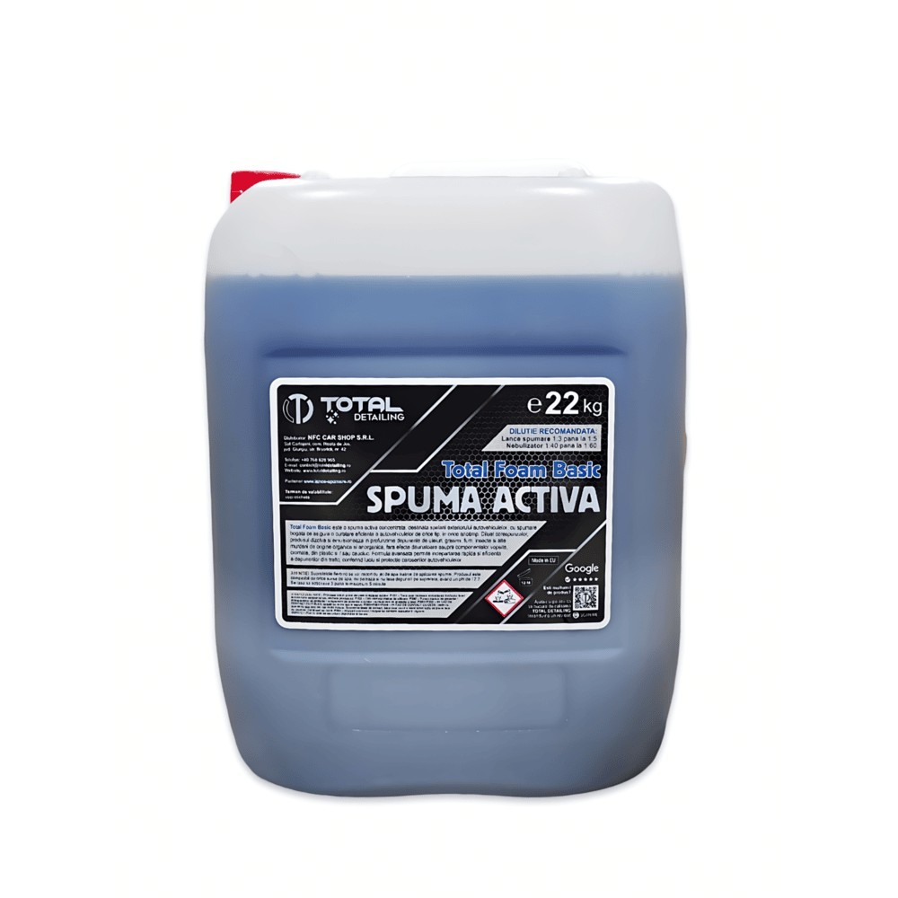 Spuma activa Total Foam Basic Produsul Spuma activa Total Foam Basic este un produs profesional ce vine in sprijinul proprietarilor de spalatorii auto (manuale sau self), al service-urilor auto, al detailerilor, precum si al utilizatorilor casnici care doresc o curatare a suprafetelor fara griji, prin obtinerea unei spume tip frisca / zapada, foarte consistenta, care persista pe caroseria masinii sau a oricaror alte suprafete ce se doresc a fi curatate. Spuma activa Total Foam Basic este disponibila in 3 variante, mai exact 5 kg, 11 kg, respectiv 22 kg (echivalentul aproximativ a 4,5 litri, 10 litri, respectiv 20 litri). Spuma activa Total Foam Basic este o solutie concentrata pentru spalarea exterioara a autovehiculelor. Indeparteaza rapid si eficient uleiuri, grasimi, insecte si murdarie, oferind luciu si protectie caroseriilor. Total Foam Basic este o spuma activa concentrata, destinata spalarii exteriorului autovehiculelor, cu spumare bogata ce asigura o curatare eficienta a autovehiculelor de orice tip, in orice anotimp. Diluat corespunzator, produsul dizolva si emulsioneaza in profunzime depunerile de uleiuri, grasimi, fum, insecte si alte murdarii de origine organica si anorganica, fara efecte daunatoare asupra componentelor vopsite, cromate, din plastic si / sau cauciuc. Formula avansata permite indepartarea rapida si eficienta a depunerilor din trafic, conferind luciu si protectie caroseriilor autovehiculelor. Retineti!!! Dilutie recomandata: Lance spumare 1:3 până la 1:5 sau Nebulizator 1:40 până la 1:60. Se lasa sa actioneze 3 pana la maximum 5 minute. Produsul Spuma activa Total Foam Basic este o spuma activa pentru exterior ce are un continut de soda caustica mediu de 4,5%! Produsul este compatibil cu orice sursa de apa, nu pateaza si nu lasa depuneri pe suprafete, avand un pH de cca. 12.2. ATENTIE! Suprafetele fierbinti se vor racori cu jet de apa inainte de aplicarea spumei. In imaginile de mai jos puteti observa spuma actionand pentru curatarea diferitelor suprafete (jante, caroserii, etc), aceasta fiind aplicata atat cu nebulizatorul (cum este cazul ATV-ului), cat si cu lancea de spumare (cum este cazul autoturismului), insa aceasta poate fi pulverizata si cu ajutorul vermorelelor sau a altor tipuri de dispozitive de pulverizare. ATENTIONARI!!! H314 – Provoaca arsuri grave ale pielii si lezarea ochilor; P101 – Daca este necesara contactarea medicului tineti la indemana recipientul sau eticheta produsului; P103 – Cititi eticheta inainte de utilizare; P280 – Purtati manusi de protectie / imbracaminte de protectie / echipament de protectie a ochilor / echipament de protectie a fetei; P302+P352 – IN CAZ DE CONTACT CU PIELEA: spalati cu multa apa si sapun; P305+P351+P338 – IN CAZ DE CONTACT CU OCHII: clatiti cu atentie cu apa timp de mai multe minute. Scoateti lentilele de contact, daca este cazul si daca acest lucru se poate face cu usurinta. Continuati sa clatiti; P501 – Aruncati continutul / recipientul conform legislatiei in vigoare. EUH210 – Fisa cu date de securitate disponibila la cerere. Domenii de utilizare Spalatorii auto profesionale; Detailing auto premium; Service-uri auto; Ateliere de intretinere industriala; Utilizatori casnici. Cod UFI: AP20-N0WH-Y004-A8KC Daca doriti sa comandanti diferite accesorii pentru lancile de spumare, cum ar fi site (de diferite greutati), duze (de diferite diametre) sau altele, dati click aici, iar daca doriti sa comandanti si alte accesorii pentru aparatele de spalat cu presiune, cum ar fi furtunuri pentru desfundat canalizare, seturi complete de pistoale si lanci de apa, filtre, duze de pulverizare si seturi de 5 duze (cu cuplare rapida), piese de legatura pivotante sau altele, dati click aici si veti putea vedea intreaga noastra oferta de accesorii! De asemenea, puteti gasi videoclipuri cu produsele noastre pe canalul nostru de YouTube https://youtube.com/c/nfccarshop, pe care vi-l recomandam sa il vizitati si sa va abonati, fiind astfel permanent la curent cu noutati si sfaturi despre lancile de spumare si alte produse conexe aparatelor de spalat cu presiune! Va multumim pentru vizita facuta in cadrul magazinului nostru si nu uitati ca ne puteti vizita si pe marketplace-ul Emag.