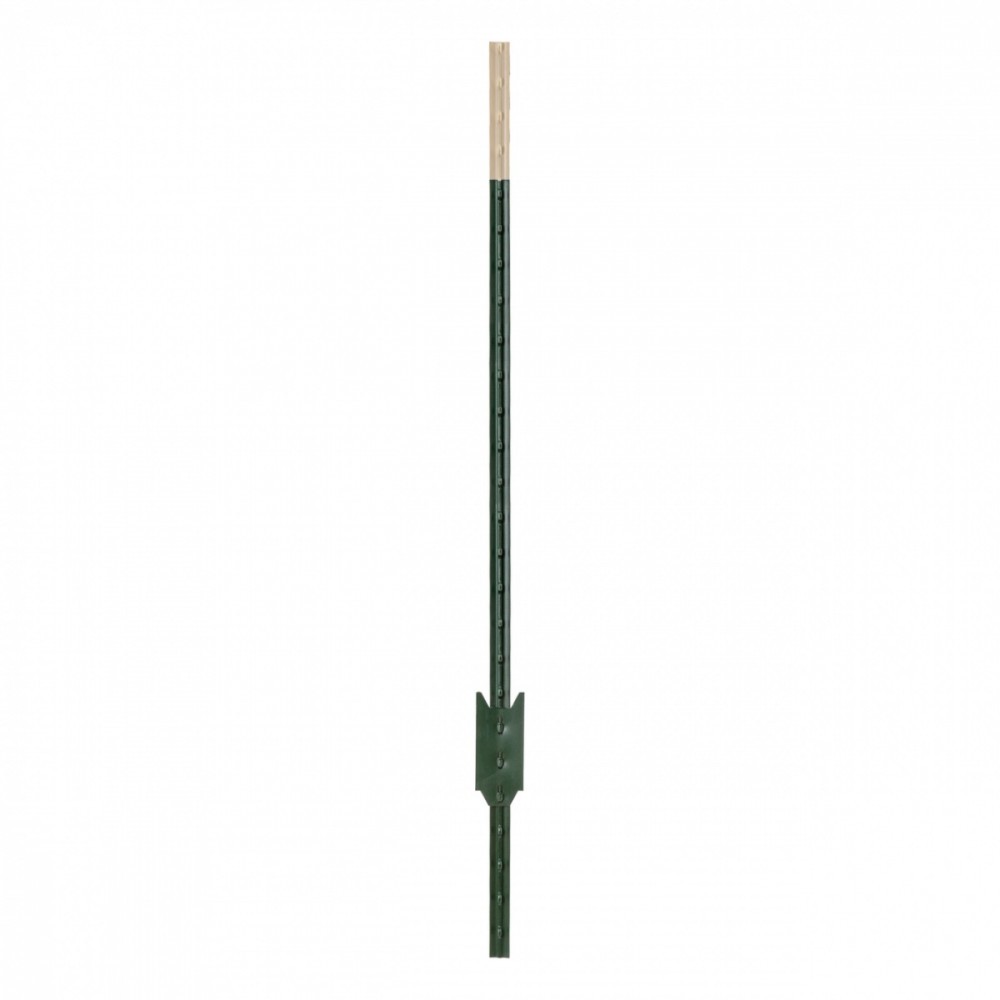 Stâlp metalic T-post, cu înălțimea de 152 cm. Stâlpii de tip T-post reprezintă o soluție foarte productivă de a construi un gard (electric). Acest sistem este bine cunoscut și este utilizat pe scară largă în America, de unde și provine. Sistemul T-post permite construirea rapidă a gardurilor durabile prin oferirea a trei factori principali: Durabilitatea stâlpilor – materialul de bază fiind oțel pentru șine, distrugerea lor prin coroziune este redusă. Întărirea colțurilor gardului – sistemul vă pune la dispoziție elemente ușor de montat care, prin utilizarea stâlpilor adiționali, permit o stabilitate excepțională a colțurilor. Întărirea capetelor gardului, sau a laturilor porților – ca și colțurile gardului, porțile gardului electric, construite cu sistem T-post, necesită stabilitate extremă, ceea ce este asigurată de elemente speciale. Sistemul T-post în principiu constă din stâlpi metalici, prevăzute cu dinți care permit susținerea fermă a elementelor gardului (plase, izolatori). Datorită materialului relativ gros, stâlpii rezistă la coroziune în timp pentru ani de zile. Aripă de conducere Stâlpul este prevăzut cu aripă de conducere. Acest element asigură o intrare în pământ fără ca stâlpul să se rotească în timpul introducerii. De asemenea, aripa de conducere marchează adâncimea corectă a stâlpului. Beneficii Sistemul T-post oferă următoarele beneficii: Introducerea foarte ușoară a stâlpilor în pământ – deoarece materialul este relativ subțire și este din oțel, se poate construi garduri lungi de kilometri într-o zi. Sistem bine gândit pentru susținerea firelor gardului electric – trebuie să utilizați doar două tipuri de izolatori pentru un anumit conductor (fir sau bandă) pentru a construi gardul electric. Sistem bine gândit pentru susținerea plaselor, etc., în cazul în care doriți să construiți doar gard simplu (neelectrificat) – dinții stâlpilor T-post permit o fixare sigură a tuturor plaselor care sunt utilizate la construirea gardurilor. Sistem ușor de implementat pentru întărirea colțurilor – cu doar 3 piese colțurile devin foarte stabile. Sistem ușor de implementat pentru întărirea capetelor de gard sau a porților – cu doar două piese aceste elemente ale gardului devin stabili. Mutare ușoară – îndată ce gardul nu mai corespunde cerințelor teritoriului, stâlpii se pot extrage cu ușurință din pământ și pot fi reutilizați într-un alt loc. Date tehnice Înălțime: 152 cm Greutate: 2,84 kg Video prezentare