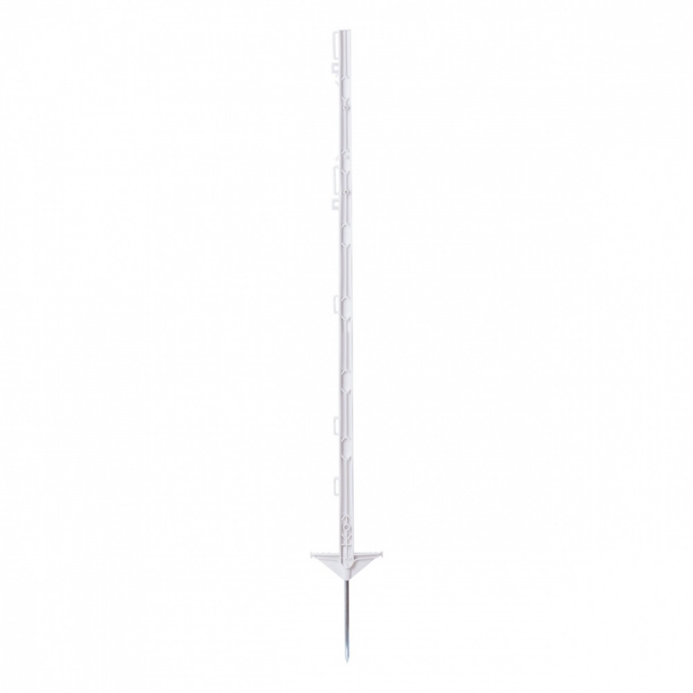 Stâlp din plastic, ideal pentru garduri electrice temporare care se mută des. Stâlp plastic flexibil pentru construirea rapidă a gardurilor electrice temporare, destinate pentru împrejmuirea animalelor domestice. Prin utilizarea stâlpului nu aveți nevoie de izolatori separate – stâlpul este prevăzut la diferite înălțimi cu locații pentru fir și bandă gard electric. În partea de jos stâlpul este prevăzut cu un vârf din oțel galvanizat care permite înfigerea ușoară în pământ. Se recomandă amplasarea stâlpilor din plastic la fiecare 5 metri. În cazul gardurilor cu stâlpi din plastic, este necesară utilizarea unor stâlpi mai rezistenți la colțuri, porți și capete, pentru a asigura stabilitatea gardului. În plus, pentru segmentele de gard mai lungi, se recomandă amplasarea unor stâlpi de întărire intermediari la fiecare 25–50 de metri. Un avantaj al stâlpului reprezintă treapta de rulare dublă ceea ce permite o înfigere mai ușoară în pământ. Date tehnice Înălțime totală105 cmÎnălțime utilă85,5 cmLungime vârf18 cmMaterialPlastic Fire și benzi suportate Stâlpul este prevăzut cu suporturi pentru fir/frânghie cu diametrul max. 6 mm și pentru bandă de max. 40 mm. Consultați poziția firelor/benzilor pe schema de mai jos: Poziția și dimensiunea maximă a firelor și benzilor Video prezentare