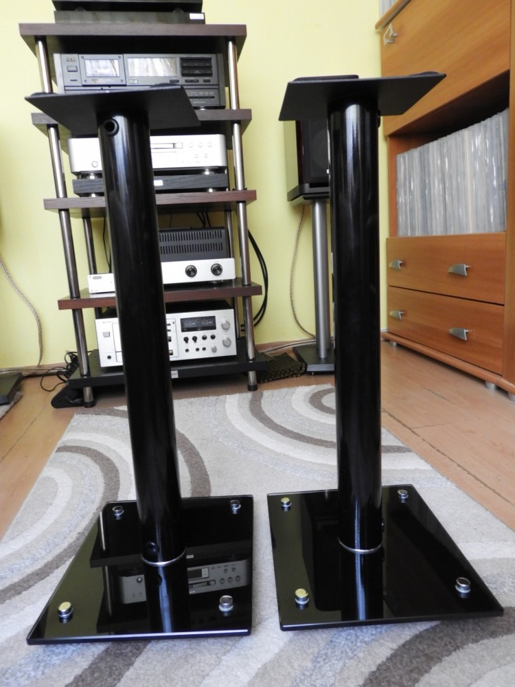 - Stativ boxe Din Sticla Negru piano cu cable management - Dimensiuni: Inaltime 60 cm , baza mare 30 x 25 cm , baza mica 17 x15 cm - Compatibilitate universala, spike-uri din otel pentru stabilitate mai mare pe orice suprafata.,Suporta pana la 30 kg.