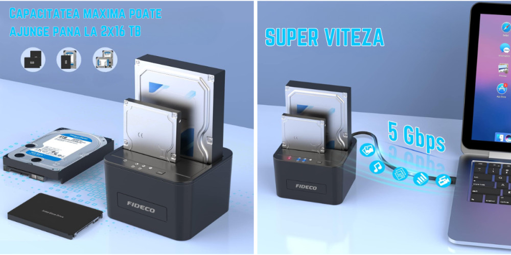 Statie de Andocare Hard Disk Dubla FIDECO USB 3.0 - Extindeți Capacitatea de Stocare cu Eleganță