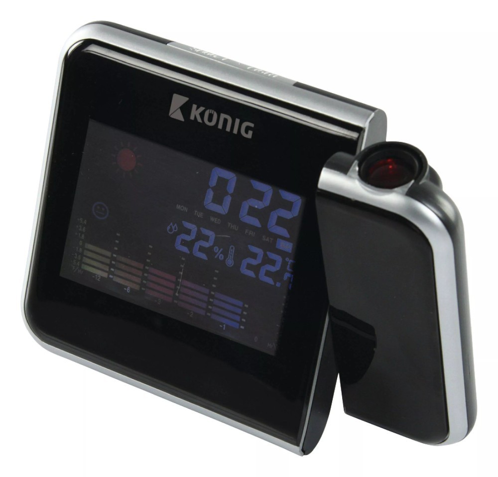 Statie meteo cu proiectie si prognoza vremii Konig.Ceas pentru a afisa cele mai recente conditii meteorologice si pentru a proiecta timpul pe un perete sau pe alta suprafata mare.Este echipat cu o alarma cu optiune de amanareAfiseaza conditiile meteorologice curente.Ofera o prognoza detaliata.Echipat cu functie de calendar.Echipat cu un ceas cu alarma cu functie de amanareContinutul pachetului:1x ceas de proiectie.1x manual adaptorCeas: 12/24 ore.Calendar: Pana la 2099.Temperatura: ° C / ° F.Interval de temperatura: 0-50 ° C / 0-122 ° F.Higrometru: 2,099%.Prognoza meteo: Da.Ceas cu alarma : Da.Alimentare: adaptor de 4,5 V.Folosire Prognoza meteo.Tip De interior.Caracteristica Ceas de proiectie.Alarma.Calendar.Amanare functie.Culoare Negru.Material Plastic.Tensiune de intrare 230 V.Afisa LCD.Tipul bateriei 2x AAA.Frecventa 50 Hz.Umiditate 20-99 %.Temperatura interioara 0 ... 50 ° C.Dimensiunea principala a unitatii 150 x 65 x 115 mm.Nr. De baterii 2x AAAMarca: KONIG