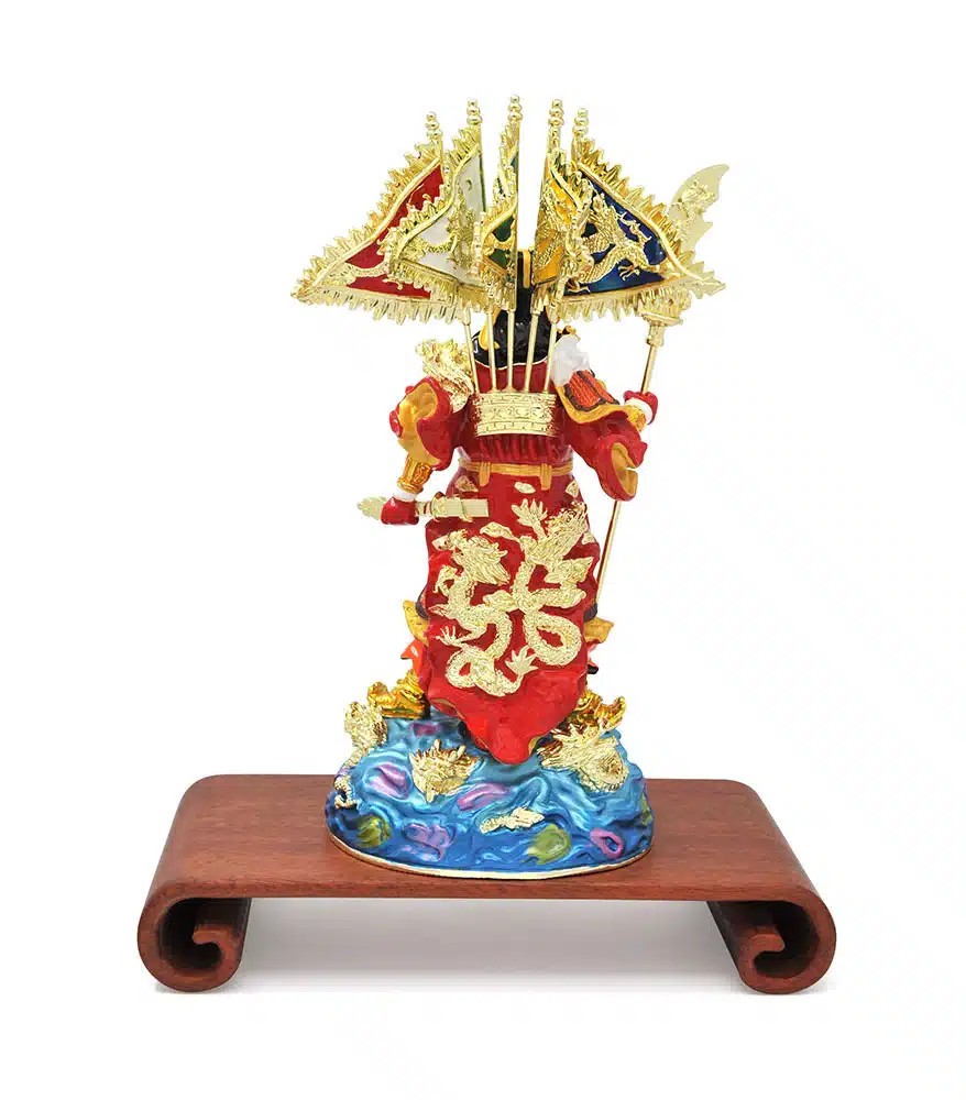 Kwan Kung este foarte iubit de chinezi ca un zeu războinic, precum și ca un zeu bogăție. Se spune că el este protectorul celor asupriți, Sfântul Patron al Poliției, Zeitatea Gardiană a Triadelor și astăzi, de asemenea, protector pentru politicieni și liderii de afaceri. El protejează împotriva trădărilor de orice fel și îmbunătățește spiritul războinic, ajutându-i pe cei care au nevoie să navigheze în situații competitive, dezgomotoase sau periculoase. În 2023, având în apropiere imaginea lui Kwan Kung, trezește Starul Războinic, adus de Paht Chee al anului. Activarea acestei calități permite obținerea succesului prin depășirea oricăror obstacole sau concurență care ți-ar putea sta în cale. Se spune că, cu cât imaginea lui Kwan Kung este mai feroce, cu atât este mai puternic! Prezentat aici cu fața roșie și robe roșii cu mai mulți dragoni, el îți dă curajul să-ți asumi riscuri, să încerci lucruri noi, să mergi mai departe cu idei noi, protejându-ți în același timp flancul împotriva rivalilor. Înfățișat cu 5 steaguri, el înseamnă că victoria este deja a ta! Plasați Kwan Kung cu 5 steaguri într-o poziție proeminentă în casa dvs., unde puteți vedea imaginea lui zilnic. Cel mai bine dacă se află în partea din față a casei, cu fața la ușa din față. Acest magnific Kwan Kung a fost realizat cu cea mai bună precizie și finisat de artizani pricepuți din China. Fiecare piesă este facuta pentru a se asigura că are expresia potrivită pe față, prezentând putere și autoritate, dar și bunăvoință și compasiune.