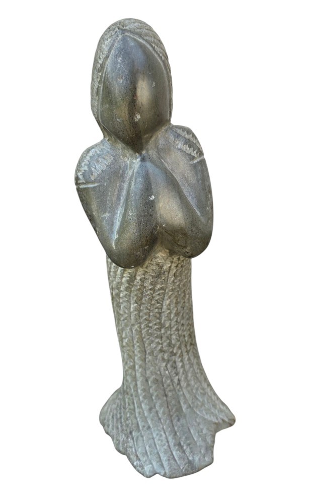 Statuetă vintage Republica Dominicană, lucrata manual din steatit, sculptată într-o formă antropomorfă stilizată, cu fața netedă și brațele aduse la piept într-o postură de rugăciune. Suprafața prezintă alternanță de zone lustruite și zone gravate cu motive repetitive diagonale și verticale, imitând textura unui veșmânt.