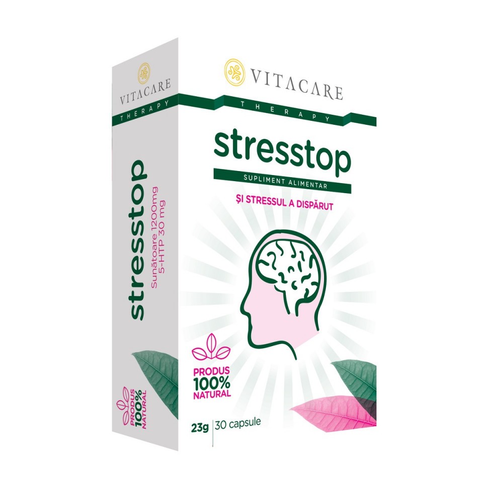 StresStop este un supliment alimentar inovator, conceput pentru a contribui la păstrarea bunei dispoziții și a unui nivel optim de optimism, precum și la o percepție reală asupra vieții. Acesta se bazează pe acțiunea sinergică a extractului de Sunătoare (Hypericum perforatum) și Griffonia simplicifolia, care oferă o sursă naturală de 5-HTP.
