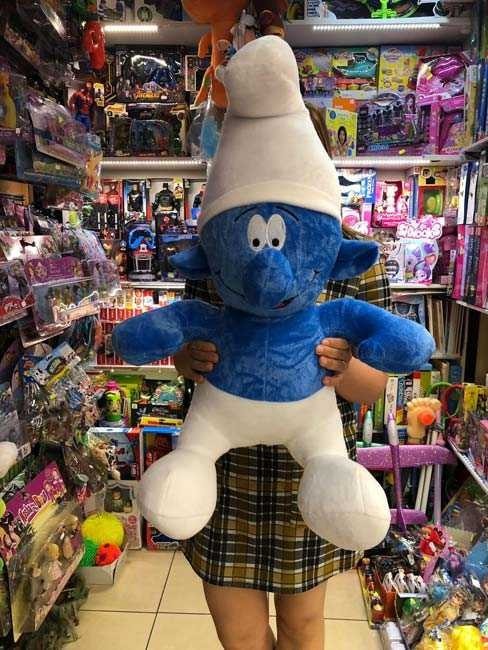 Strumf de plus . Inaltime strumf 80 cm . Material textil . Recomandat pentru copii cu varsta peste 3 ani. Se curata prin spalare sau stergere cu o carpa umeda .
